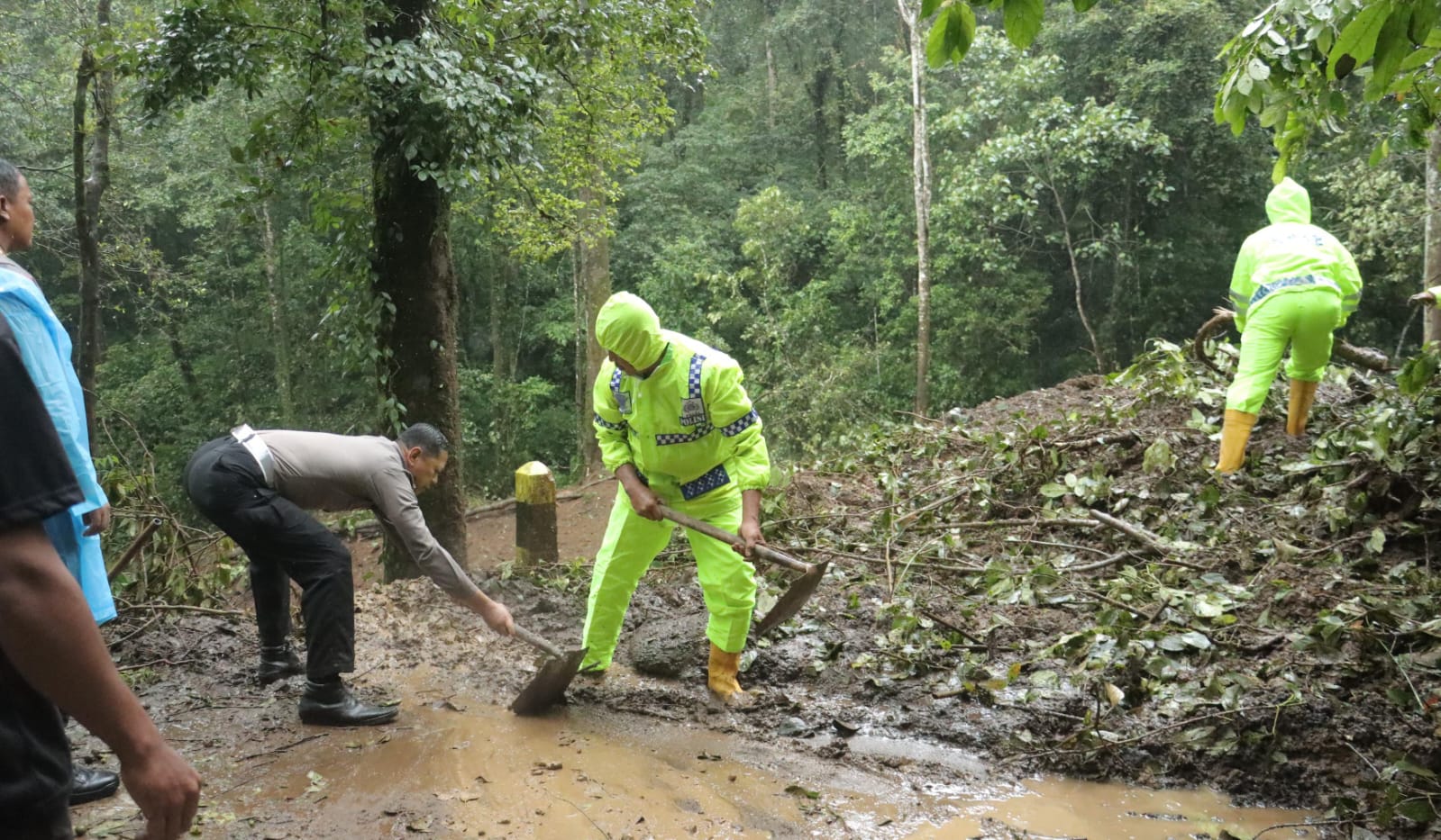 “Saat ini para anggota kami bersama TNI dan juga Relawan masih berjuang keras untuk membersihkan material longsor yang menutup jalan,” ujar AKBP Ihram.