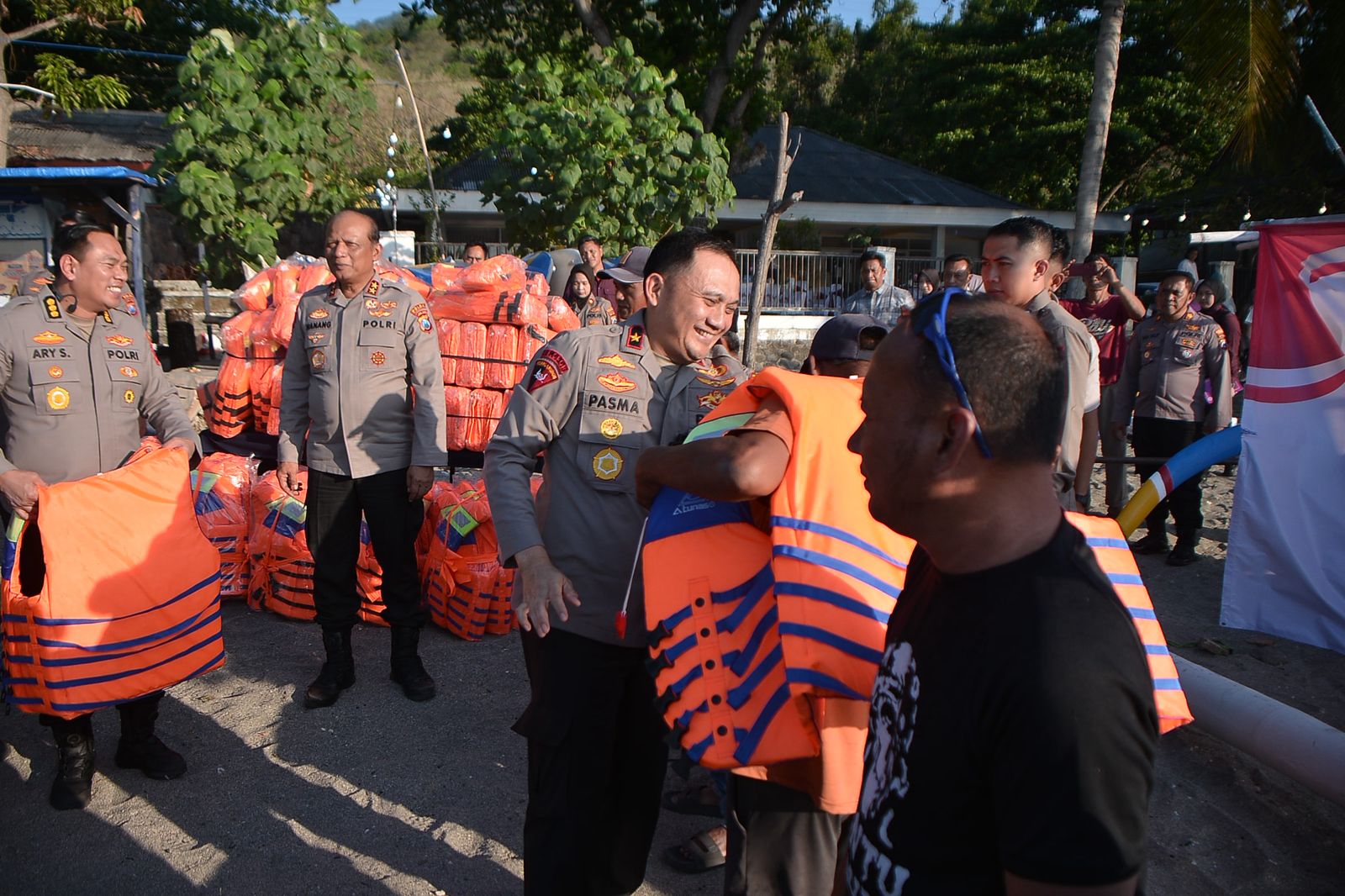 Kapolda Jatim juga memberikan rompi pelampung untuk keamanan serta bingkisan sembako untuk para nelayan.