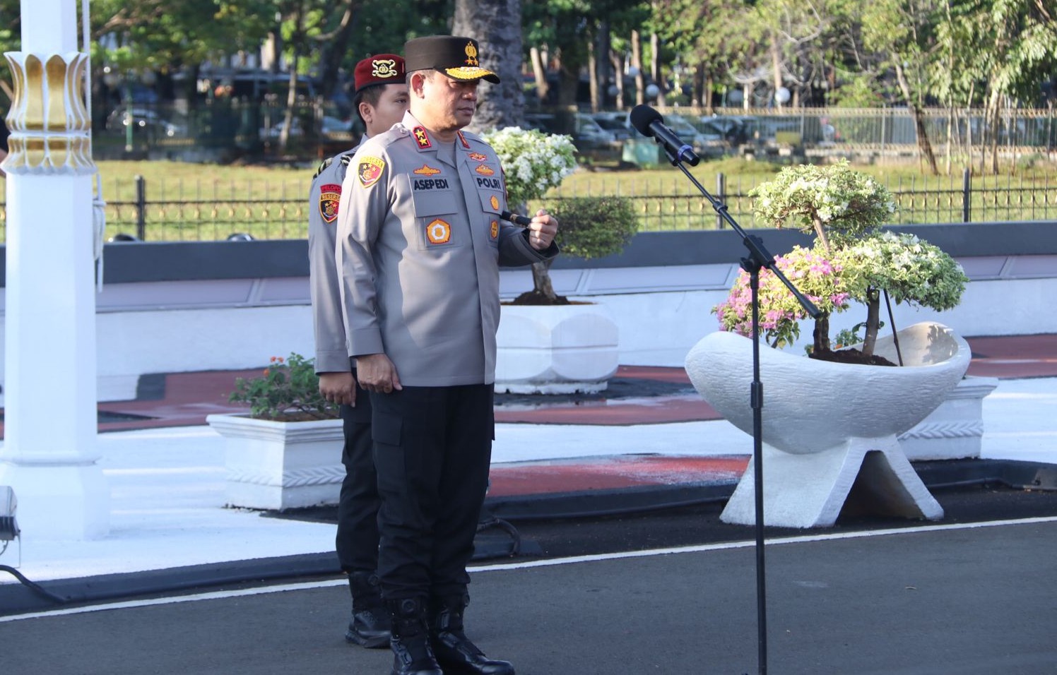 “Kendalikan diri kita, sabar dan terukur. Jangan mudah terprovokasi, jangan ada pelanggaran aturan. Semua bergerak satu komando,” kata Irjen Asep dalam arahannya.