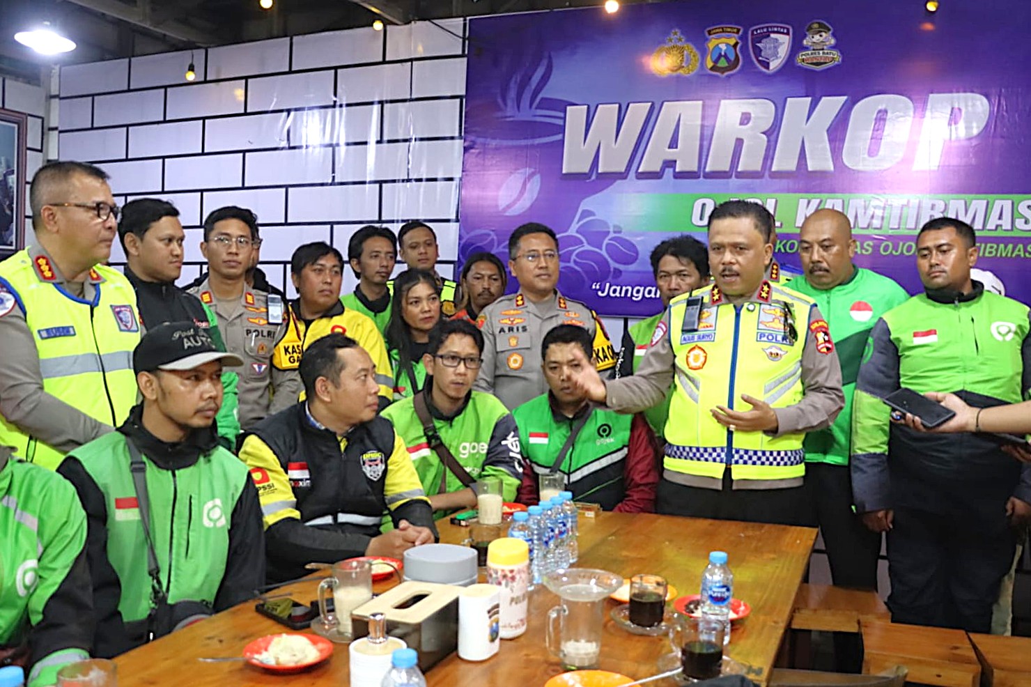 Melalui Program Polantas Menyapa, Kakorlantas Polri yang didampingi Direktur Lalu Lintas (Dirlantas) Polda Jatim, Kombes Pol Iwan Saktiadi dan Kapolres Batu AKBP Aris Purwanto tatap muka berdialog dengan para pengemudi Ojol.