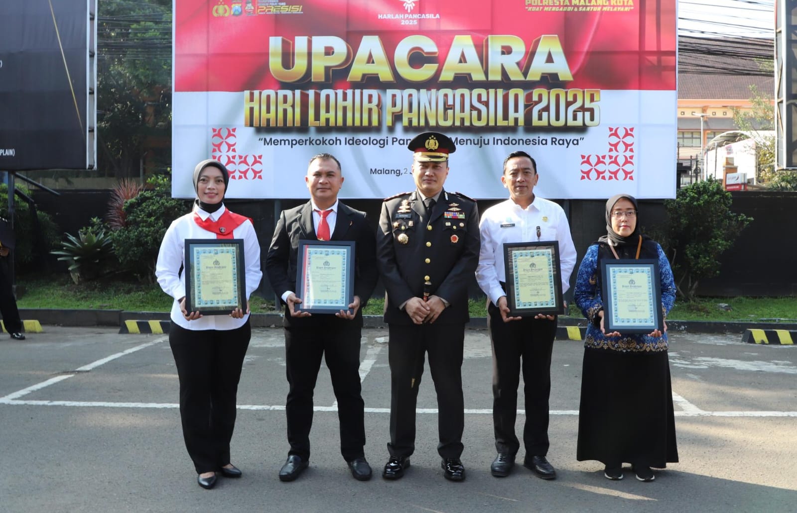Upacara dan pemberian penghargaan ini menjadi bentuk komitmen Kapolresta Malang Kota dalam mengimplementasikan nilai-nilai Pancasila secara nyata melalui tindakan preventif, preemtif, dan represif yang humanis serta berorientasi pada pelayanan publik yang prima utk Polri Presisi.