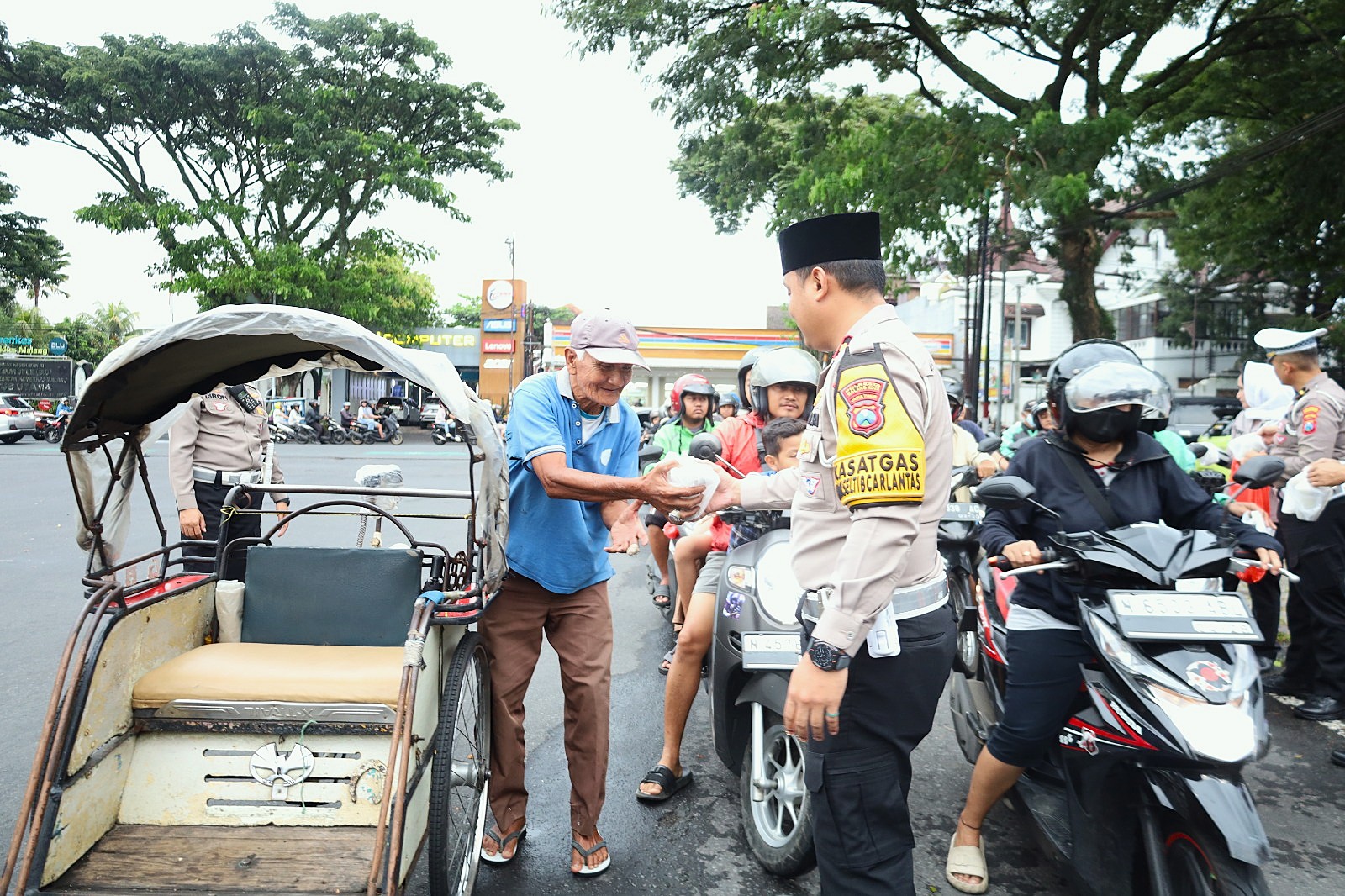 “Setiap lokasi, kami menyediakan ratusan kotak berisi makanan ringan dan minuman yang diberikan kepada Jukir, pengendara motor, penarik becak, pemulung, ojek online, pejalan kali serta pengendara yang berhenti di Traffic light” ujar Kompol Agung.