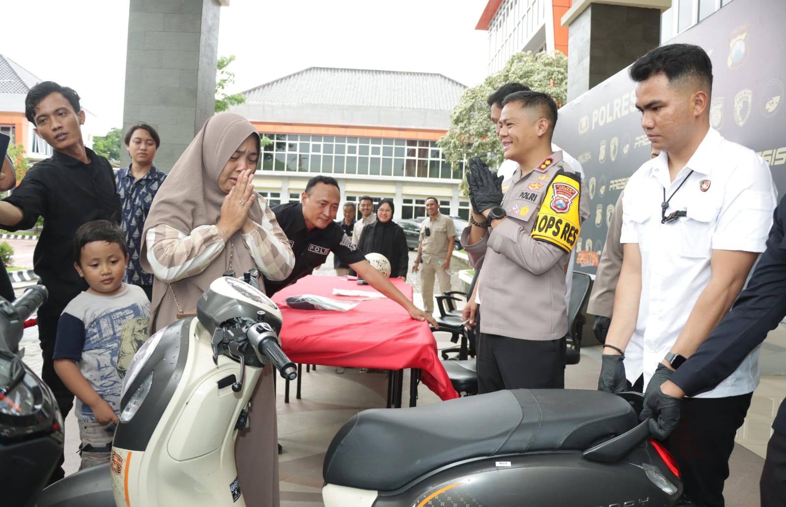 GRESIK – Kegembiraan tak terbendung terlihat dari wajah Ibu Eva saat motornya yang sempat dicuri berhasil dikembalikan oleh pihak kepolisian.