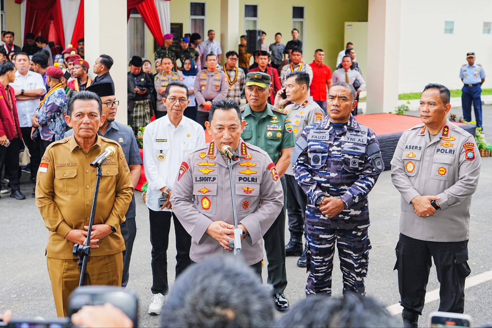 “Dan ini tentunya hanya bisa kita lakukan kalau kita bersama-sama menghadapinya dengan kompak, dengan solid, dengan semangat. Sehingga permasalahan-permasalahan yang terjadi, yang tentunya bisa berdampak terhadap situasi-situasi kamtibmas, terhadap situasi-situasi yang akan menganggu pertumbuhan ekonomi ini kita bisa hadapi,” ucap Sigit.