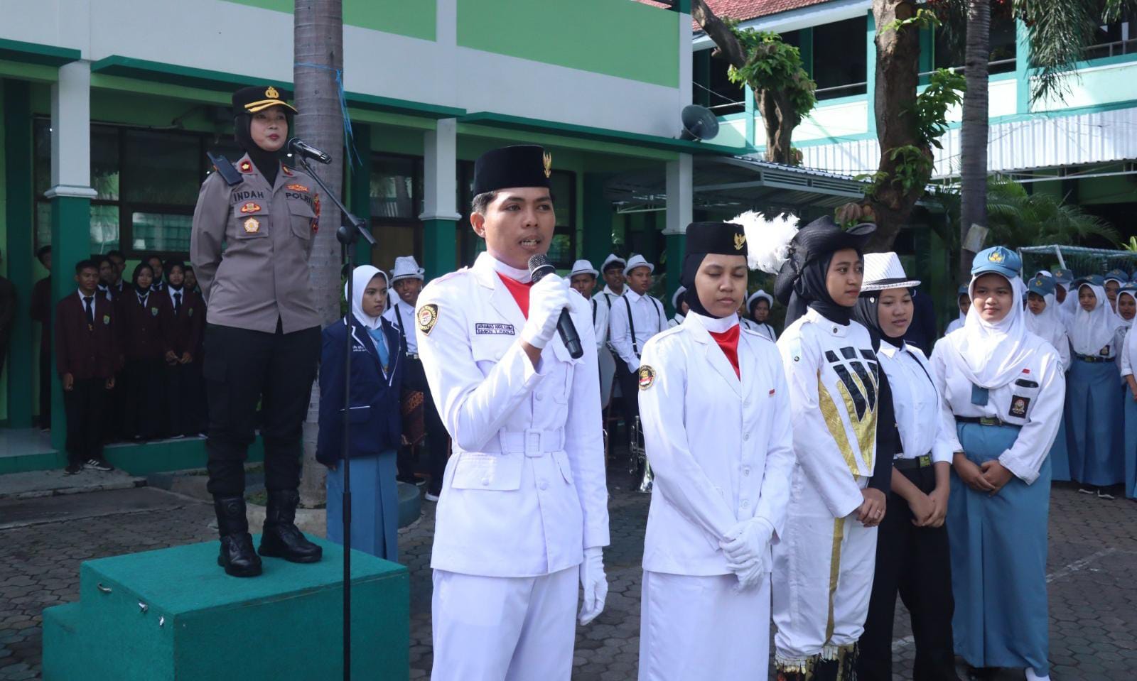 Upacara dipimpin oleh Wakapolres Situbondo Kompol Indah Citra Fitriani, S.I.K., M.Si., dan dihadiri Kepala SMKN 1 Panji, Paimin, M.Pd, Kasat Binmas AKP Djembadi, Polwan Polres Situbondo, para Guru serta pelajar SMKN 1 Panji sebagai peserta upacara.