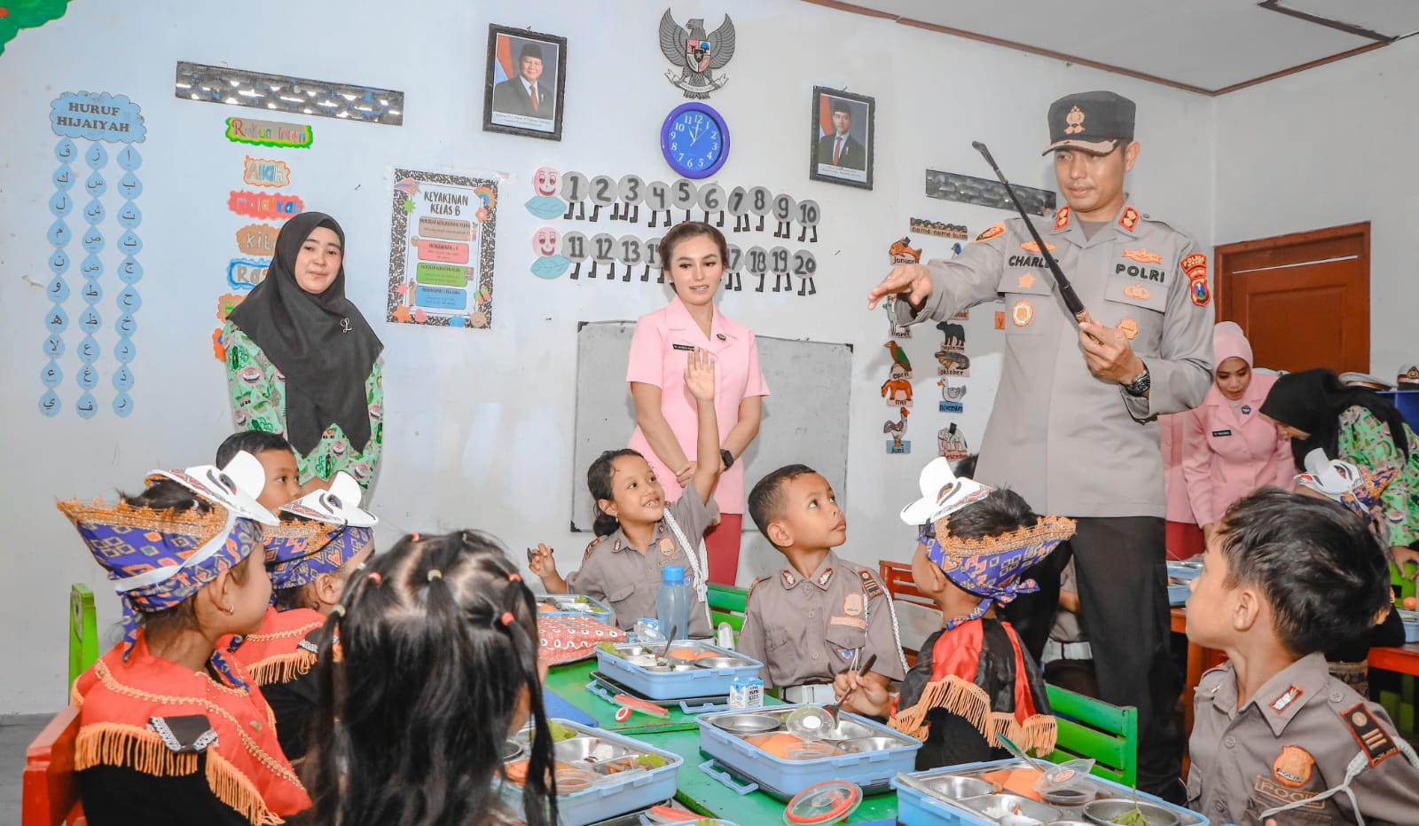 NGAWI – Kapolres Ngawi AKBP Charles Pandapotan Tampubolon bersama Ketua Pengurus Yayasan Kemala Bhayangkari (YKB) Cabang Ngawi Ny. Patricia Charles T, berbagi makanan bergizi dan susu gratis di TK Kemala Bhayangkari 57 Sine.